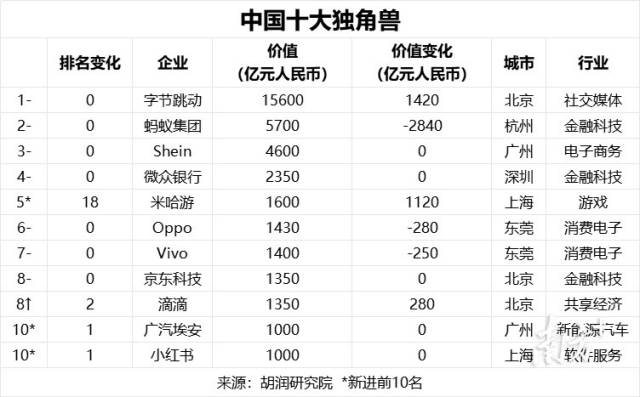 全球前十名独角兽中,共有4家来自中国。字节跳动以1.56万亿元人民币的价值连续第三年成为全球价值最高的独角兽,其他3家分别是蚂蚁集团、SHEIN和微众银行。其中,来自广州的快时尚电商SHEIN再次进入全球榜单前十,广汽埃安首次跻身中国榜单前十,成为全球最大的新能源车企独角兽。