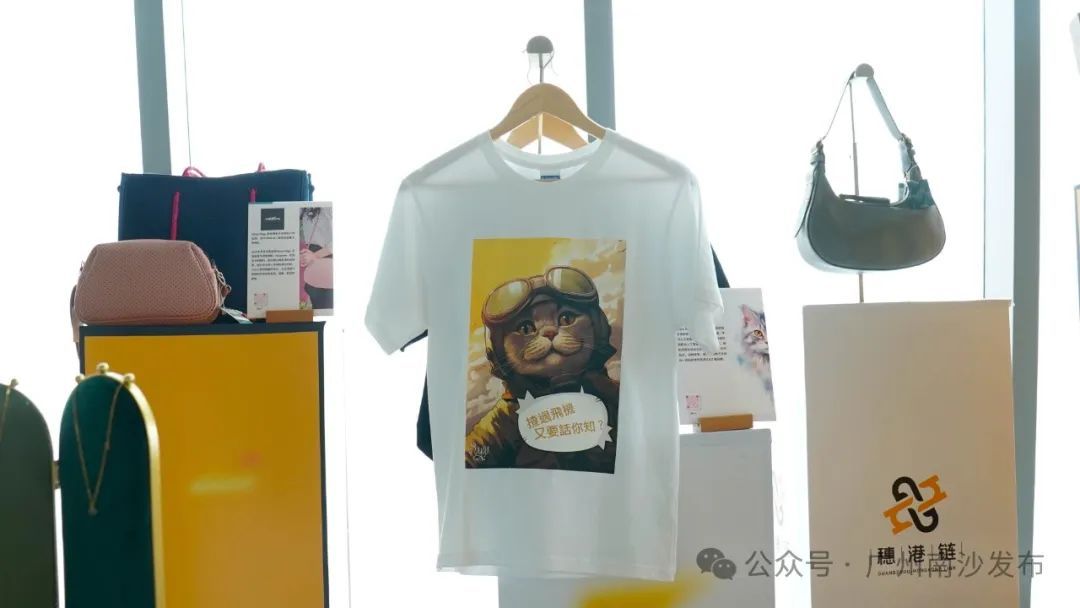 陈迪峰还拿出了一件T恤讲述了设计师的故事,设计师通过和AI合作,创造了一个新的IP“港式傻猫”,每件T恤上还有一句不同的香港俚语,将人工智能、手工漫画、街头文化都集合在一个系列的T恤之上。