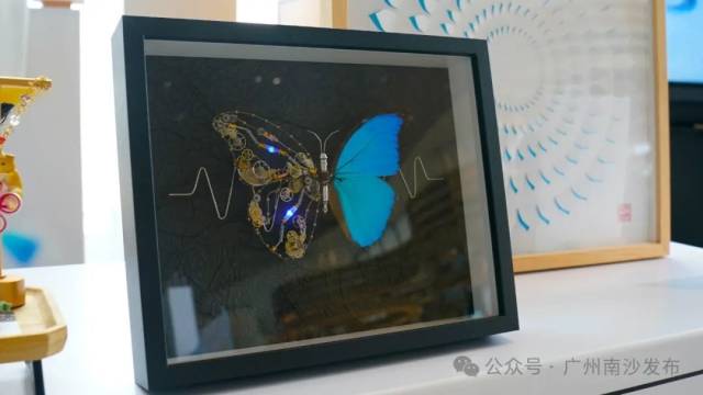在另一个展位,Wheres玮思创想创始人陈迪峰展示了一个蝴蝶摆件,与众不同的是这只蝴蝶的右半翼是蓝色的原生标本,左半翼则由齿轮、电路板组成,显示了工业化和大自然结合成为现代之美。