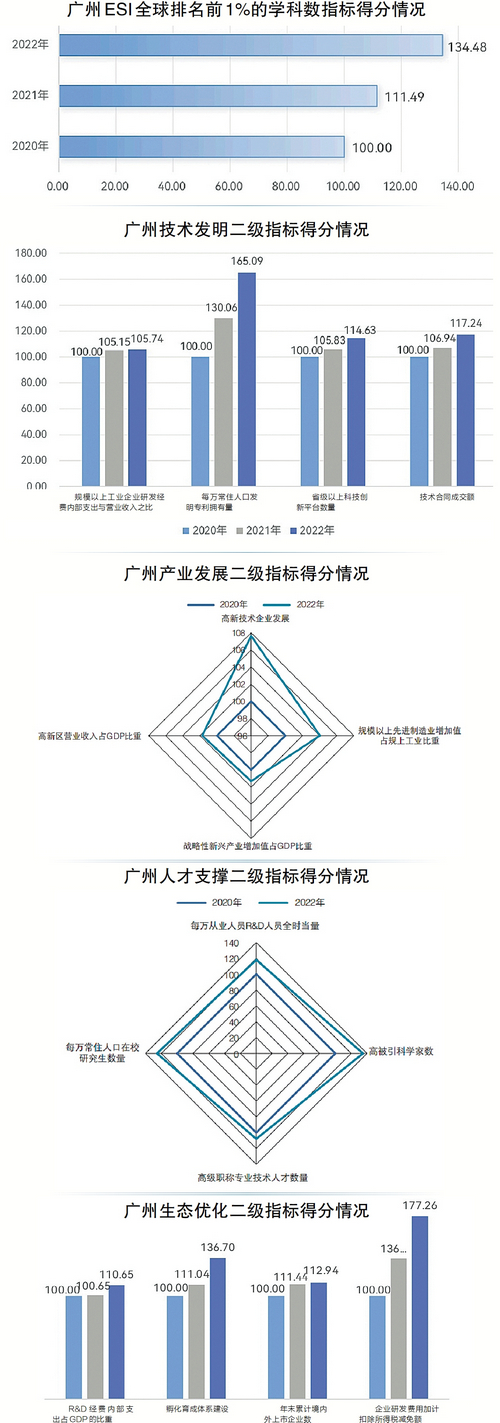 2022年该指标得分为134.39分,年均增长17.19分,改善最为显著。近年来,广州不断加大全社会研发投入,畅通“科技-产业-金融”循环体系,持续优化创新创业生态环境。2022年,R&D经费内部支出占GDP的比重达到3.43%,创新近十年来最大增幅,是全国唯一实现连续9年稳定增长的一线城市,较上年提高0.31个百分点;创新创业发展活力竞相迸发,创新创业大赛国家、省、市获奖企业总数迅速增长,年末累计境内外上市企业持续增长;精准落实研发费用加计扣除政策,企业研发费用加计扣除所得税减免额约为2020年的1.8倍,同比增幅在20个指标中居第二。广州生态环境优化取得显著成效,全面激发社会创新创业潜能,推动科技创新成果源源不断涌现。