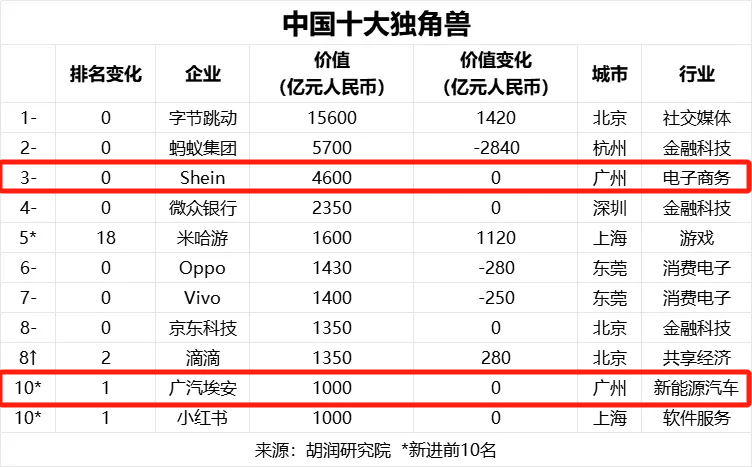 同时,在中国十大独角兽榜单中,广州占据的两席也均为来自番禺的企业——希音、广汽埃安(分列第3、第10)。