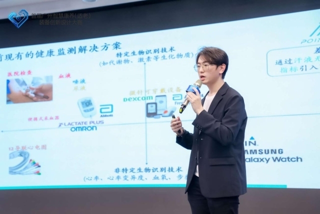来自中国香港的“智能可实时监测的皮肤贴片汗液传感器”项目,是一款透过汗液生物标记物来追踪健康状况的超薄皮肤贴片。不再需要复杂的线路连接,薄薄一片像创可贴一样,就能监测乳酸、皮质醇、葡萄糖等变化情况。Point Fit Technology Limited联合创始人王路说:“希望通过大赛将产品推广到粤港澳大湾区,更好地跟养老院及养老行业以及相关政府机构合作,未来我们也有意愿将产品生产线落地在广州黄埔区以及其他大湾区城市。”