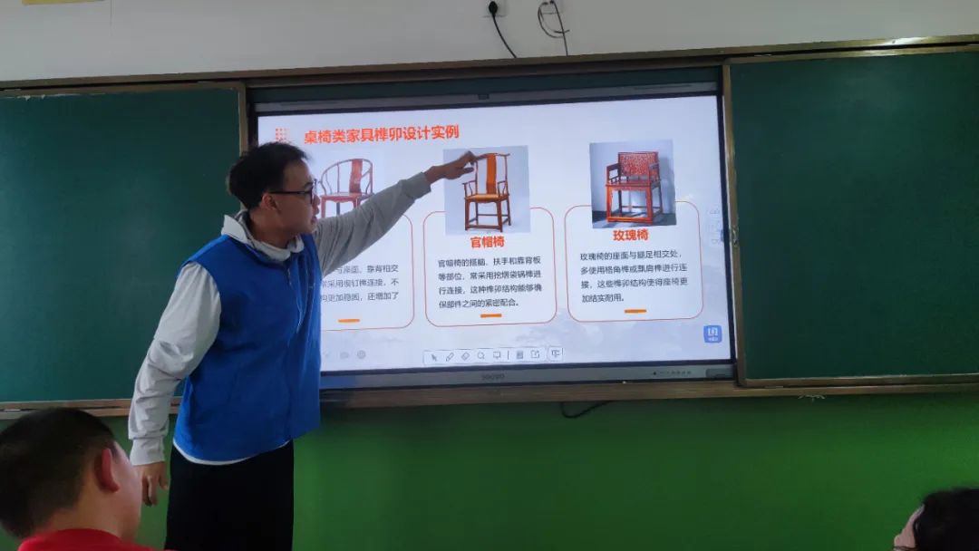 “极致吻合的魅力-中堂家具”活动中,学生们通过科普老师的讲解了解了我国古代家具中所蕴含的结构之美及榫卯结构在古代家具中的应用,让学生从中学习到古人是怎样不用一滴胶水就可以让木头牢牢地契合在一起制成一件件精美的家具,并且深入了解榫卯文化的博大精深。
