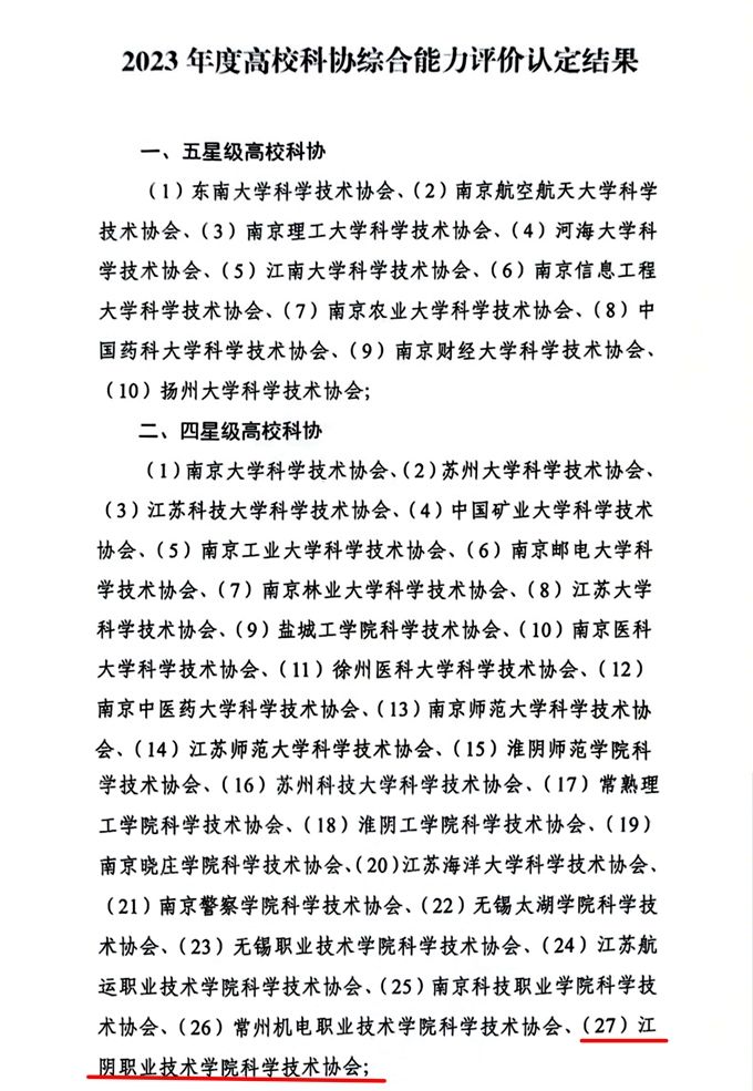 江阴职业技术学院科协喜获江苏省“四星级高校科协”荣誉