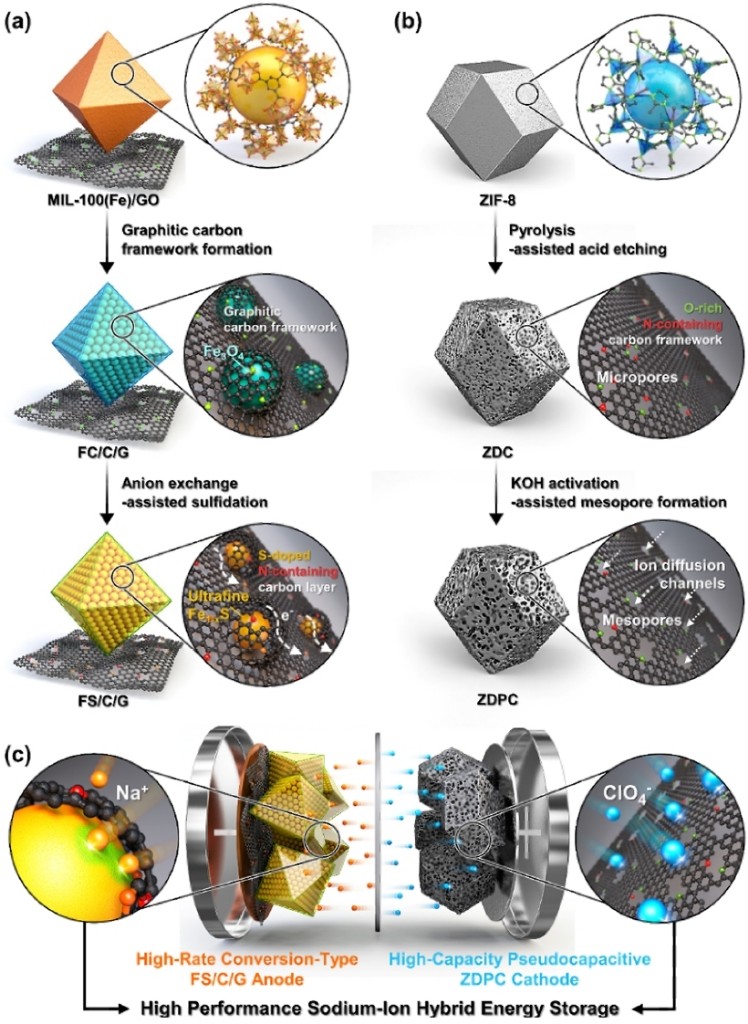 钠离子混合储能阳极和阴极材料合成过程示意图及储能机制。图片来源:KAIST官网