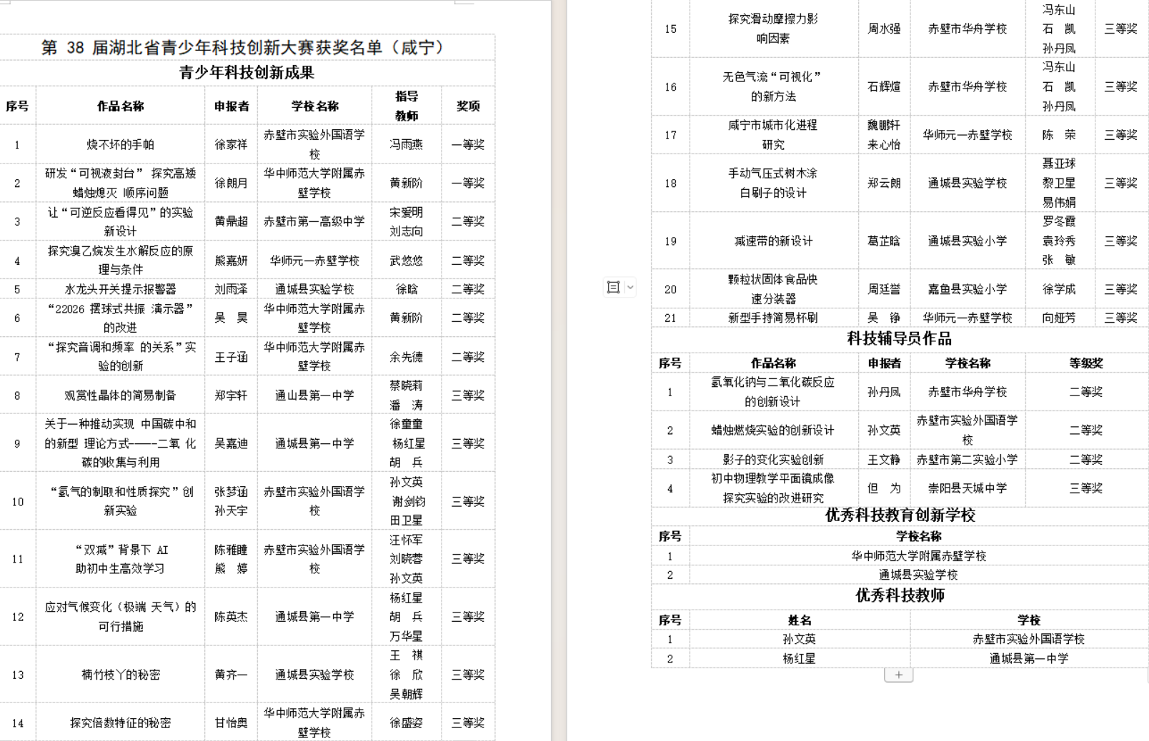 第 38 届湖北省青少年科技创新大赛获奖名单(咸宁)