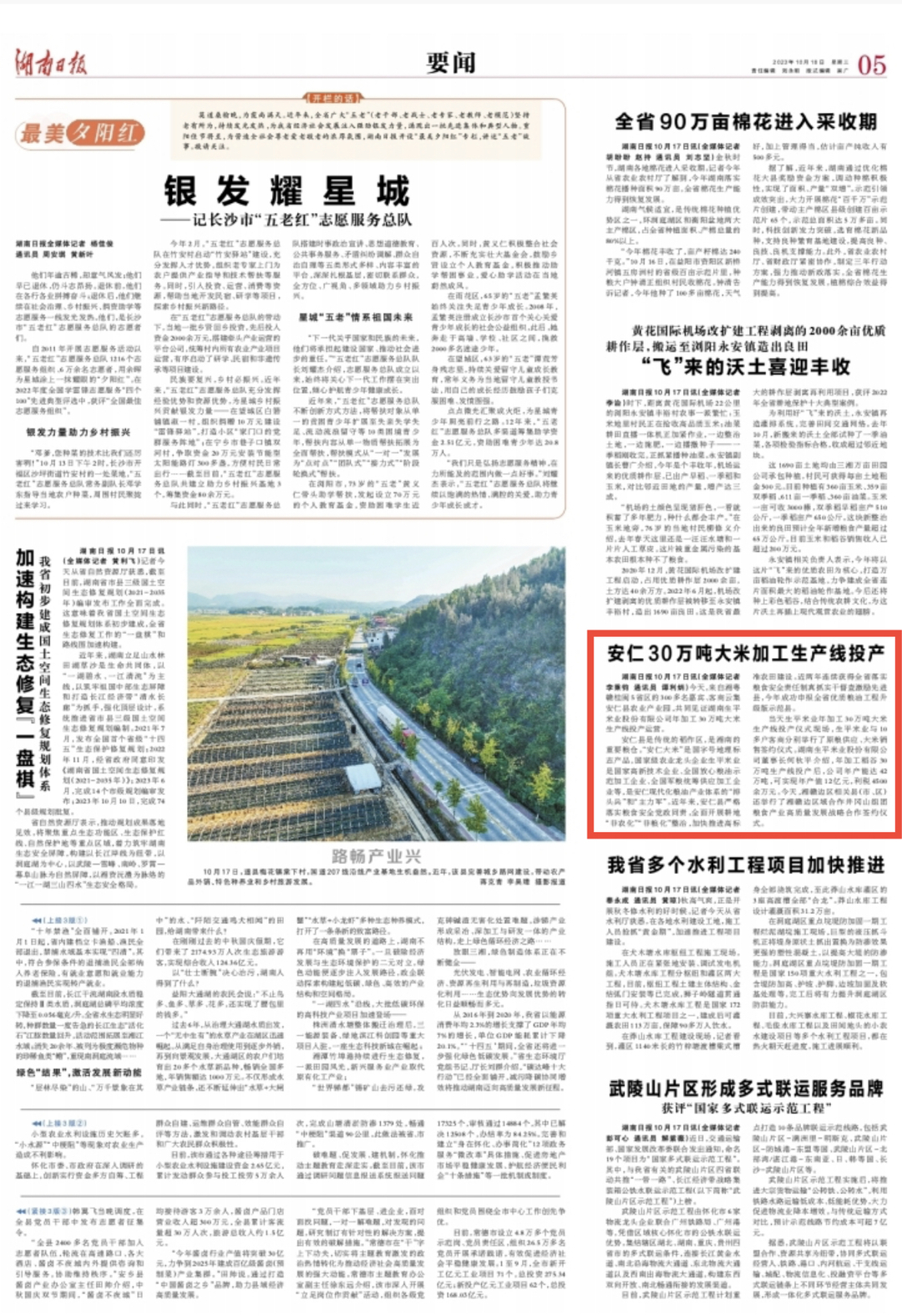 湖南日报10月17日讯(全媒体记者 李秉钧 通讯员 谭利炳)今天,来自湘粤赣桂闽5省区的300多名嘉宾、客商云集安仁县农业产业园,共同见证湖南生平米业股份有限公司年加工30万吨大米生产线投产运营。