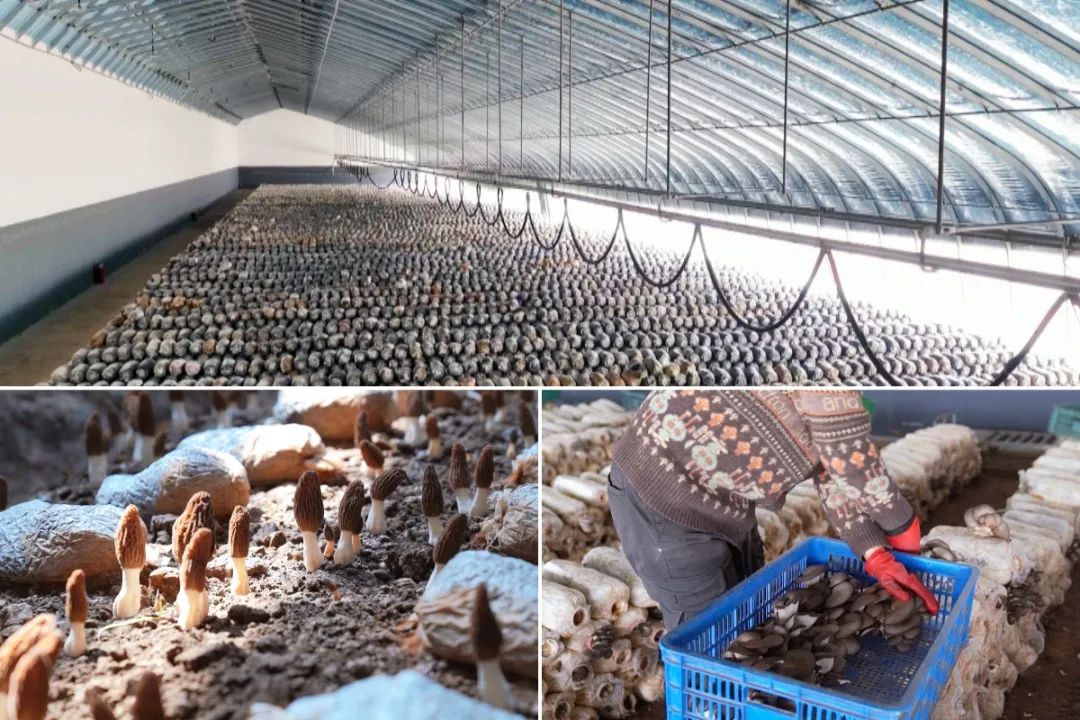 在高原村食用菌种植基地,成千上万的菌棒整齐排列,场面壮观。一朵朵羊肚菌撑着褐色的“小伞”,如雨后春笋般破土而出,旁边大棚内的平菇也跃跃欲试,工人们正在忙着采摘成熟的平菇,装箱发车送往附近的市场进行销售。