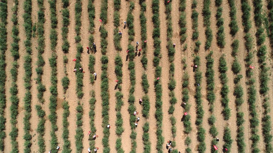 2023年6月15日,采摘工在宁夏吴忠市红寺堡区百瑞源枸杞种植基地采摘枸杞(无人机照片)。新华社记者 王鹏 摄