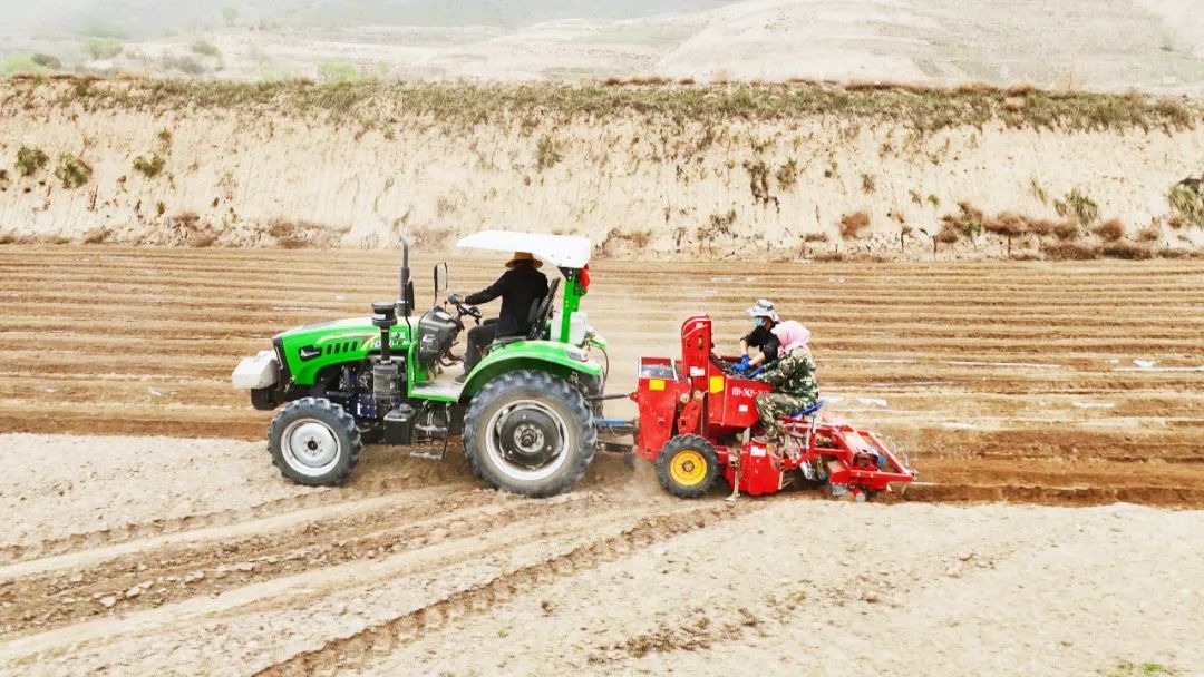 在金燕种植家庭农场,工人们熟练地将马铃薯种薯切块、拌种,将拌好的种薯装袋运送到仓储库,等待装车。来到张岔村马铃薯种植基地,伴随着阵阵轰鸣声,满载着种薯的马铃薯一体化播种机有序开展起垄、施肥、播种作业。