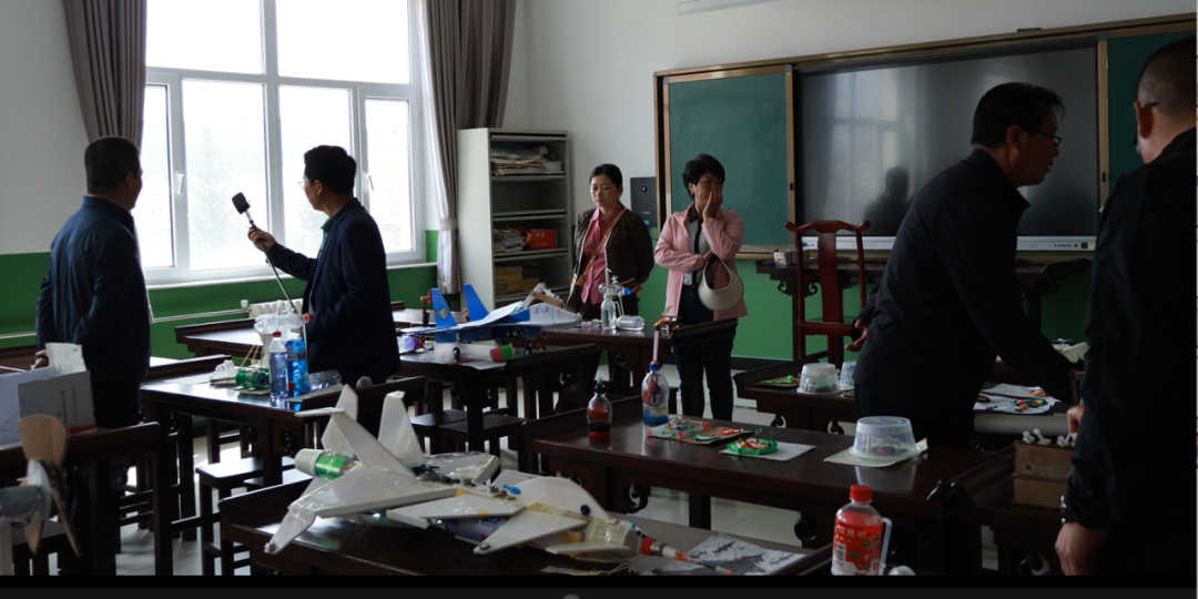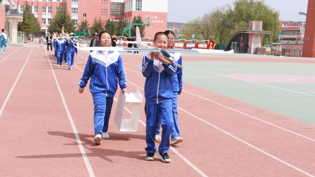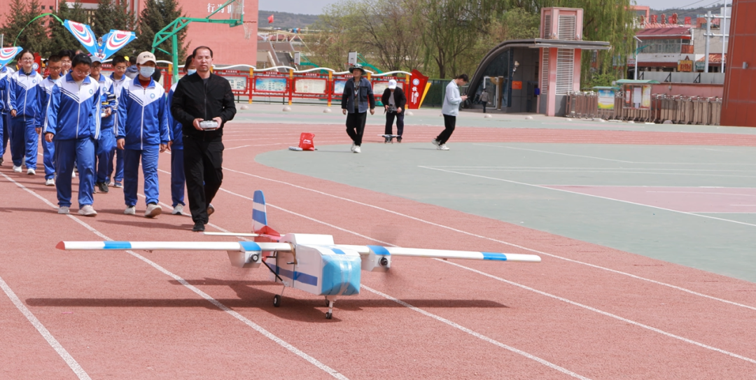 开幕式上,我校近年来在航模领域取得的成果得以展示。教师操作的三架无人机作为第一梯队率先亮相,随后是由学生操作的小精灵遥控飞机,悬挂着各共同体学校的彩旗,形成第二梯队。最后,13架由航模团队制作的飞机模型压轴出场,场面壮观,作为第三梯队。
