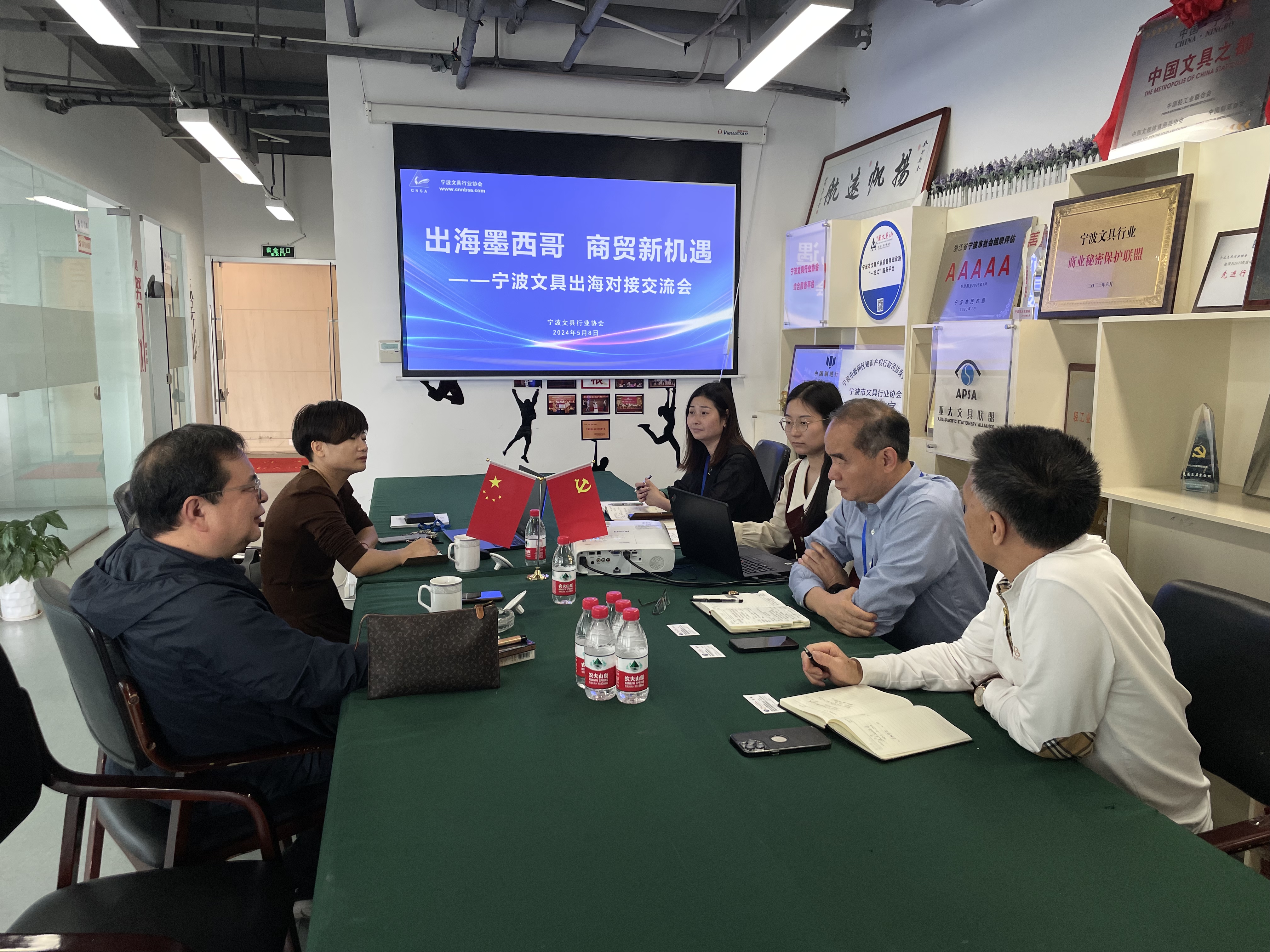 5月8日上午,宁波文具行业协会与墨西哥长江国际商会、墨西哥中国投资贸易交易会的创始人徐涌波、销售总监朱敏一行召开宁波文具出海墨西哥对接交流会,就推广及助力文具外贸企业进一步深耕墨西哥市场做相关交流。