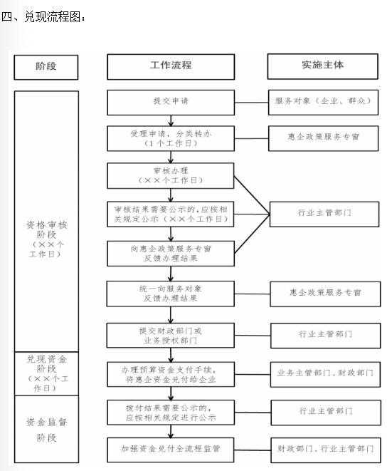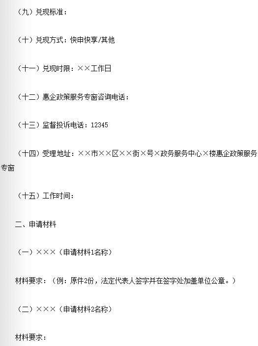 (四)规范申兑流程。对奖补范围明确、审核标准清晰、比对数据齐全的惠企政策实行“免申即享”;对暂时难以数据化的惠企政策实行“快申快享”,原则上60个工作日内兑现;对有特定兑现程序、时限要求的惠企政策,按照相关规定兑现。惠企政策执行部门负责梳理形成惠企政策兑现工作手册(附件2)和申兑指南(附件3),明确惠及对象、申报条件、兑现时限、受理地址、咨询电话等要素。2024年5月底前全面完成现行有效惠企政策工作手册和申兑指南梳理发布,新出台的惠企政策应在7个工作日内梳理发布工作手册和申兑指南。