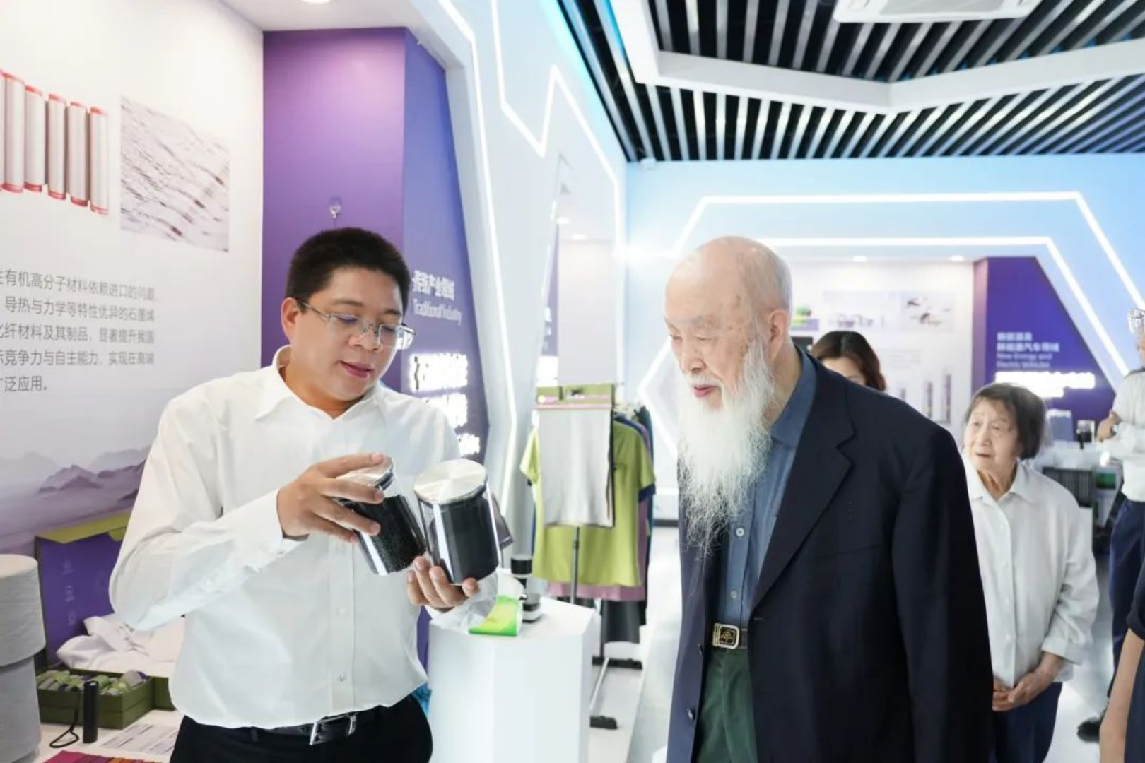 在石墨烯主题展厅,杨裕生院士了解国家石墨烯创新中心创建背景、目标定位、共性技术攻关等方面情况和进展。刘兆平就石墨烯原材料制备、产业化应用和行业服务提升等方面进行详细介绍,并展示了石墨烯在新能源、重防腐涂料、电热元件、材料改性、医疗健康等领域的应用成果。