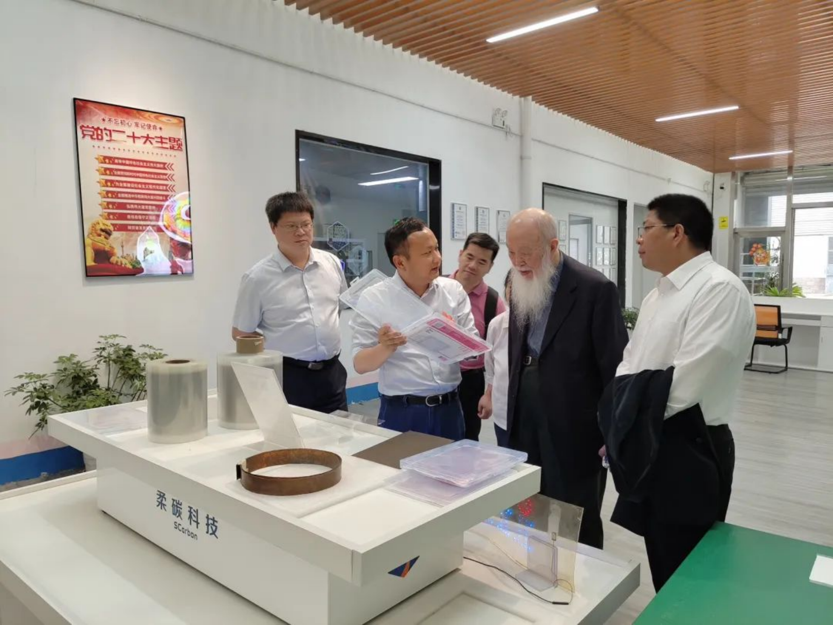 杨裕生院士一行首先来到宁波柔碳电子科技有限公司,详细了解石墨烯薄膜制备、石墨烯铜基复合材料开发以及产品应用等情况。随后,杨裕生院士来到国家石墨烯创新中心详细考察了石墨烯复合硅碳负极材料中试线建设和运行情况,了解石墨烯在新能源动力电池领域的技术攻关和产品开发情况。