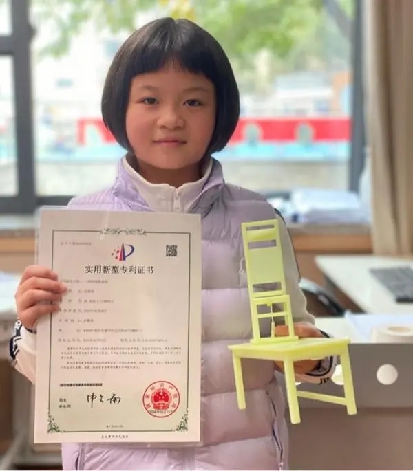 今年3月,徐紫琪发明的《一种防地震桌椅》获得国家专利,并获得2024年宋庆龄少年儿童发明奖重庆赛区小学组金奖。
