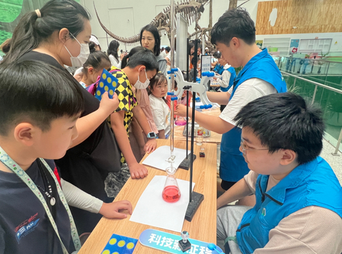 5月19日,在第八个“全国科技工作者日”即将到来之际,中国科技馆与北京大学化学与分子工程学院联合举办了“化梦为实 学以探奇”化学科普活动,来自化学学院各年级的20余名志愿者和科技辅导员一起在中国科技馆主展厅恐龙广场带领观众走入神奇的化学世界。