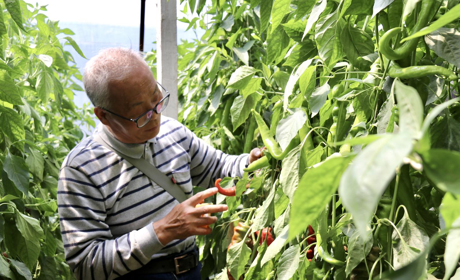 薛泉宏查看辣椒长势。