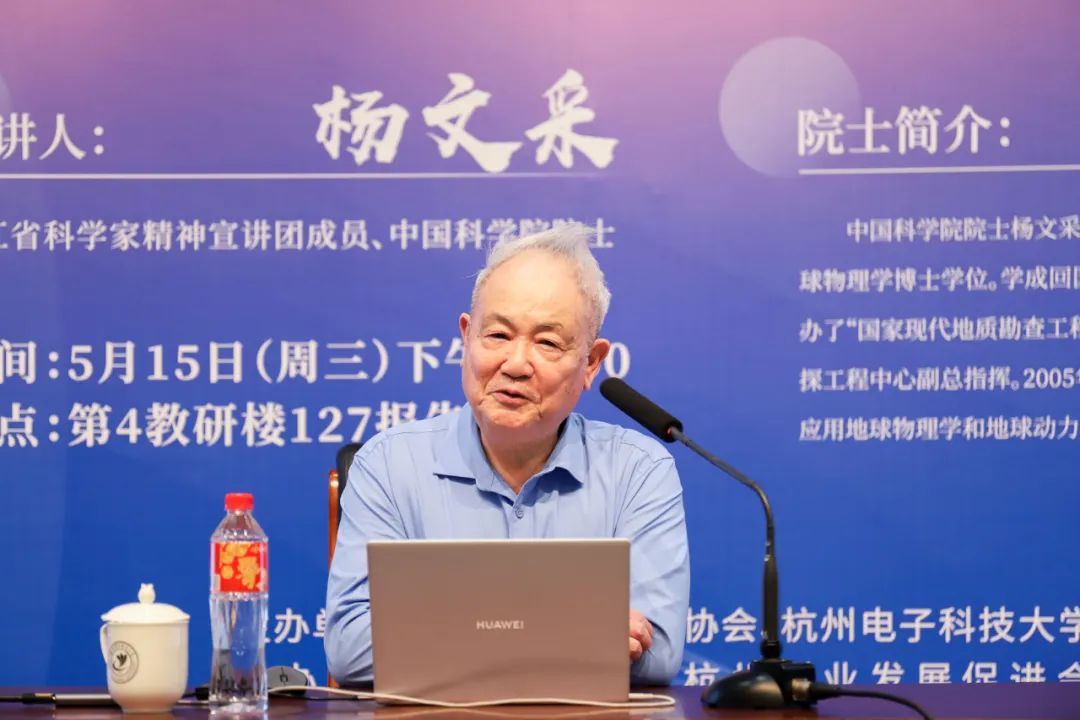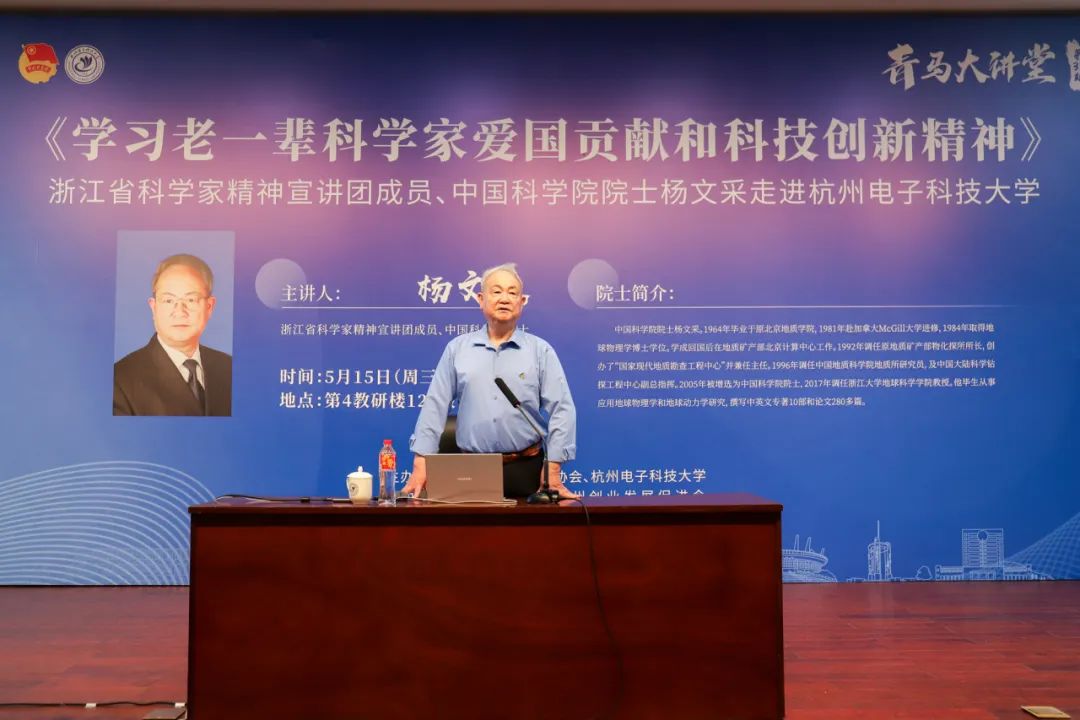 浙江省科学家精神宣讲团成员、中国科学院院士杨文采应邀进校宣讲《学习老一辈科学家爱国贡献和科技创新精神》。一同出席活动的有中国科学院地质与地球物理研究院研究员郭爱缨,省科协宣传部相关负责人,杭州电子科技大学党委书记吴卿,党委副书记戚明钧,党委委员、宣传部部长陈云和科研处、团委等部门负责人,以及各学院师生代表。