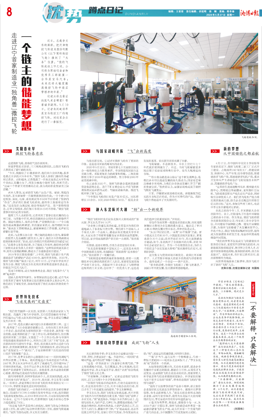 新的梦想 从中国储能之都启航 4月17日,在中国科学院院士李培根等专家的见证下,微控飞轮第二家工厂正式开工建设。占地面积242亩新工厂,将建设研发、检测中心、生产车间、综合楼等设施,新建磁悬浮飞轮产线、高速磁悬浮电机产线,重点开发和生产主动磁悬浮飞轮储能技术和产品、高速磁悬浮电机产品。 “这里将引进高精数控车床、数控卧式车削中心、高精数控外圆磨床、变频螺杆空压机、飞轮端盖装配生产线先进生产设备,同时吸引全球优秀人才。我们的飞轮生产能力将比现在提高几倍,助力企业实现迈向销售百亿元的目标。”这天,参加完毕开工典礼,电话中李文东自豪地对记者说。 在此之前的今年1月,中国储能大会在沈阳举行。会上,沈阳提出了打造中国储能之都的奋斗目标。作为链主,微控飞轮将联合沈鼓集团股份公司、哈尔滨工业大学等单位,共同建设中国储能之都。建设中国储能之都,为微控飞轮搭建了大发展的新平台,在此平台上,微控飞轮将实现跨界经营,最终成为新能源技术研发之地、磁悬浮应用高端制造中国高地。 “我们的梦想不仅是成为飞轮储能技术世界的引领者,更要凭借世界领先的技术,向新能源其他领域进军,聚世界之优秀人才,打造中国装备制造高地,服务国家战略,助力东北振兴”。提起未来,在结束记者采访时,张庆源铿锵有力地说。 向世界高端装备之巅攀登,微控飞轮开启了新的“飞轮”人生。 记者手记 “不要解释,只要解决” 作家亦舒在《变形记》中提到:“要生活得漂亮,需要付出极大的忍耐。一不抱怨,二不解释,绝对是个人才。” 采访沈阳微控飞轮技术股份有限公司,记者有无数次感动。感受最深的是公司入门处张贴的8个朴素无华的大字:“不要解释,只要解决”。作为市场经济的主体,企业在竞争中做强争胜,必须走在时代的前头、成为行业引领者。实现这个目标,要求每位员工不仅言必行、行必果,更要讲究效率、主动有为。这是一个优秀企业的最基本要求,也是一个优秀企业长期争胜的法宝。 “彪悍的人生不需要解释”这句话流传甚广,它表达了一种坚定的心态和态度。市场如战场,商机瞬间消逝,残酷竞争现实要求,每位员工讲究快速高效解决问题,而不是遇到问题寻找借口。因为只有直面问题并迅速找出解决办法,才能实现企业迅速为社会创造价值,从而赢得发展的主动。 “不要解释,只要解决”看似大白话,却深刻地揭示了企业发展普遍规律。8个大字,让记者感受微控飞轮别样风采同时,也让记者寻找到了这家成立仅5年的企业,成为东北地区唯一一家制造业独角兽企业的原因。