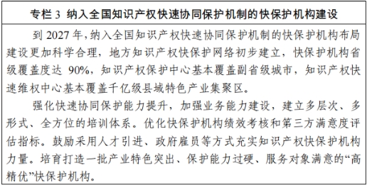 9.建设快保护机构。加强快保护机构建设布局,形成以纳入全国知识产权快速协同保护机制的快保护机构为支点,各级各类知识产权保护机构为延伸,梯次布局、协调联动的工作体系。完善知识产权保护中心和快速维权中心管理办法。鼓励地方依照纳入全国知识产权快速协同保护机制的快保护机构业务范围和运行标准,推进本辖区知识产权保护中心、工作站等保护机构建辖设,加强工作统筹和监督管理。