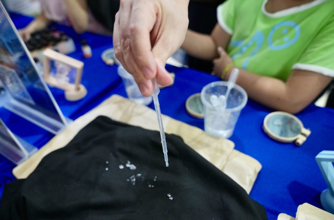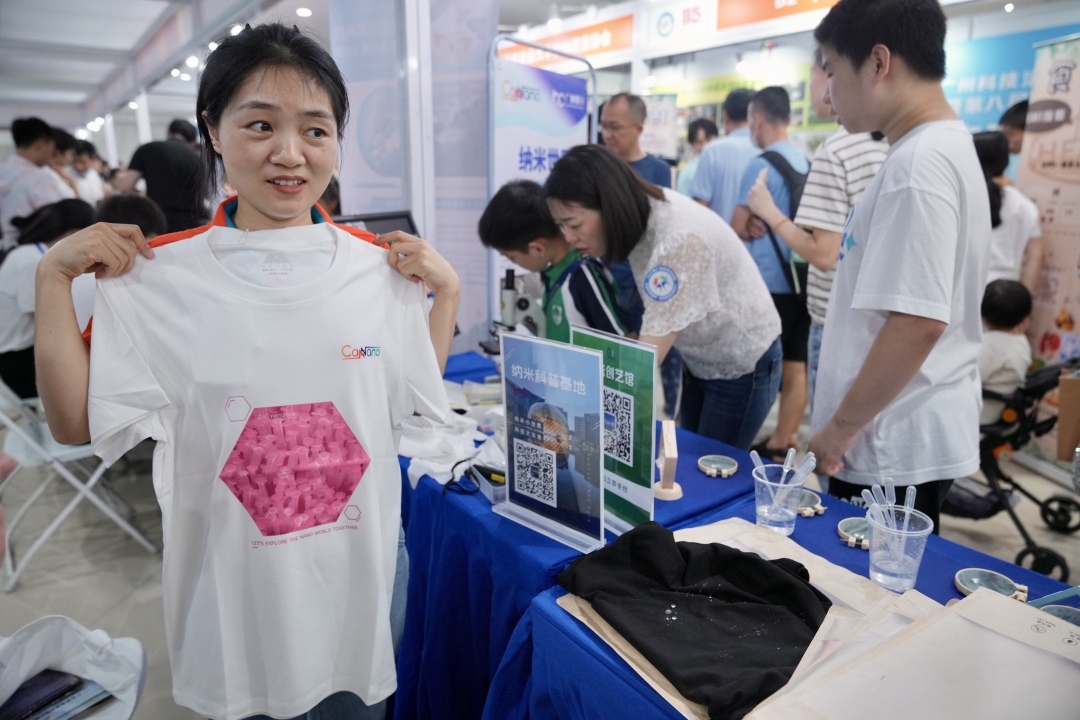 其中,广东粤港澳大湾区国际纳米科技创新研究院的“三防T恤”十分抢眼。记者在T恤上滴上一些水,这件衣服完全不吸水,就好像雨水滴在了荷叶上一样。而记者用手轻抚这件T恤,却是柔软透气的全棉质感,令人啧啧称奇。
