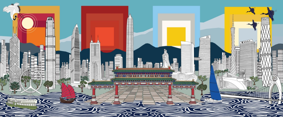 “在创作这幅作品之前,我花了一段时间在香港、深圳、广州等地生活和观察,最后选取了这些元素,以南沙为中心位将这些标志性建筑和元素联结起来,共同讲述属于大湾区的故事。”