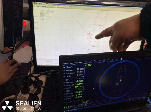 “金牛座”挖沟机搭载深海液压动力单元和可调压力流量潜水泵,与母船只通过一根光电复合脐带缆实现电力和通信供给,作业界面极其简洁。在只依赖单台声纳、超短基线无法准确定位电缆后,额外增加一台声纳及利用电磁感应原理的TSS管线探测传感器,快速对电缆完成精确定位,待挖沟机在海底调整好姿态后,便开始了连续无中断挖沟埋缆作业。整个埋缆过程十分平滑、稳定、高效,未出现任何打滑、下陷情况,压力补偿系统、液压功能系统各项指标示数良好,未出现异常报警,充分证明了其可靠性和稳定性。
