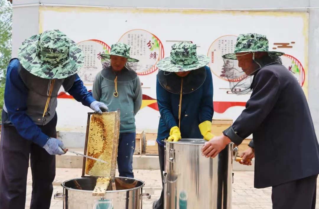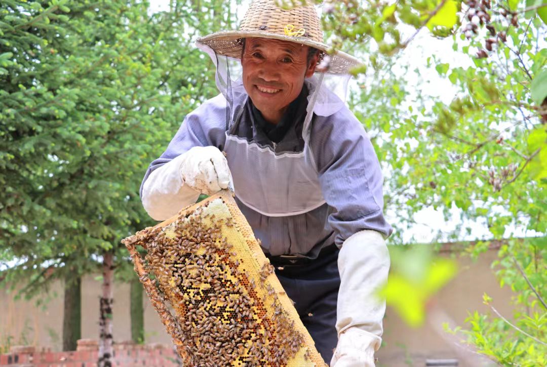 五月的石庄村,柠条花开,山涧群蜂飞舞,7000余亩退耕还林的山地已经成为了中华蜂的天然“大牧场”。村民们头戴纱帐帽,将蜂箱盖轻轻掀起,提起蜂巢,轻轻拂去板上的蜜蜂,过滤后的蜂蜜晶莹剔透、清香扑鼻,甜在乡村养蜂人的心里。“我们这回打的是柠条蜜,产量在一千五到两千斤,产值就是15万到20万元,下一茬我们转场打紫花苜蓿蜜。”石庄村党支部书记单克荣表示。