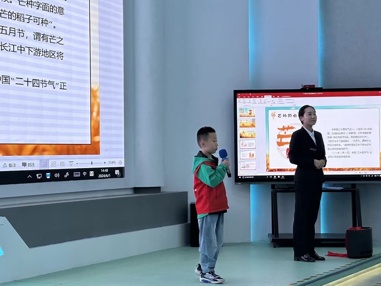 活动中,科普讲解员通过文字和图片的形式从芒种的由来、芒种的特点、芒种的习俗、芒种的诗歌四个方面介绍“芒种”的内涵,激发青少年能够了解到芒种节气的历史渊源、文化内涵以及与之相关的习俗和农业生产关系。在互动环节,同学们也结合自身实践,畅所欲言,讲述自己对“芒种”的理解和认识,现场气氛十分活跃。