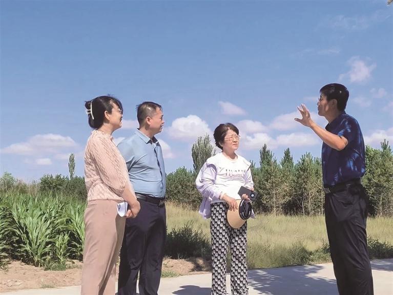 彭文栋(右一)向参观者介绍饲草情况。盐池县委宣传部供图