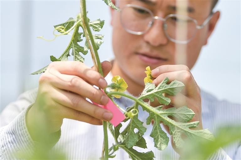 贺兰瓜菜科技小院的学生查看田间授粉质量和效果。