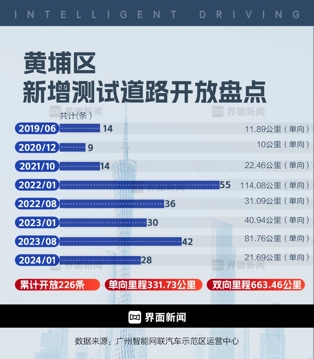 界面新闻统计发现,自2019年6月起,黄埔区陆续开放了8批智能网联汽车测试道路。2022年1月,黄埔区成为粤港澳大湾区开放测试道路里程最长的区,开放测试道路累计90条,单向共计156公里。