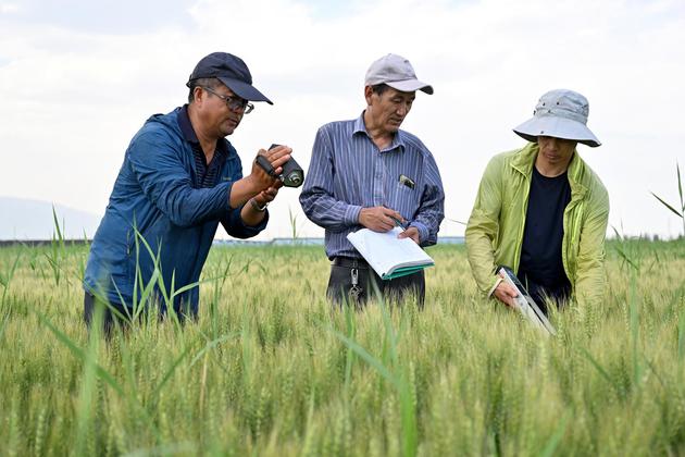 宁夏农林科学院农作物研究所研究员在麦地检测小麦叶片温度。