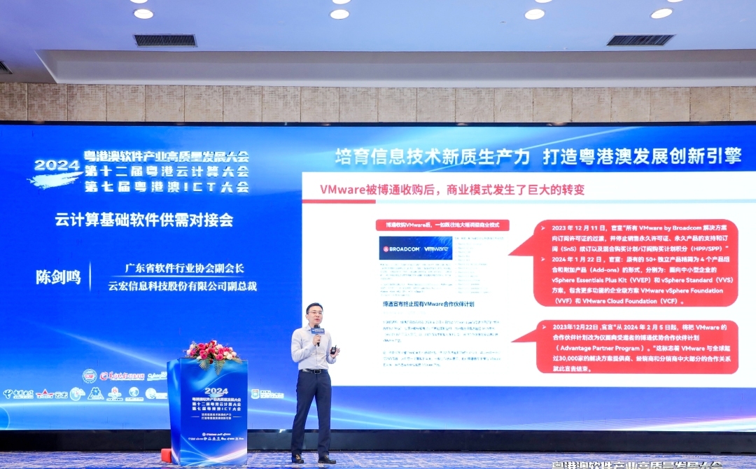 专题产业对接会以“云聚湾区,破局创新”为主题,由云宏信息科技股份有限公司承办,来自软件领域内供需两侧的重点企业、专家学者们汇聚一堂,就如何紧抓粤港澳大湾区连接中国与世界的定位,分别从云计算基础软件国产化、应用场景中的适配实践以及VMware被收购后的新变化,共同探讨在后VMware时代,企业如何在变化中寻找新的发展机遇等方面阐述精彩观点,以期加速激发新质生产力助力大湾区高质量发展。