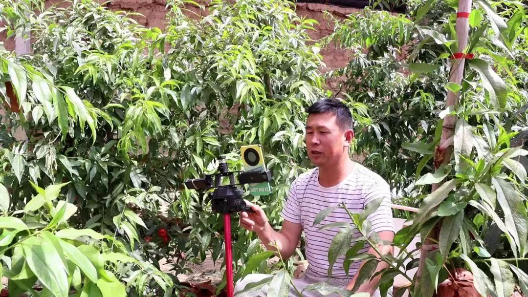 蟠桃园内果农正忙着去袋、采摘、筛选、装箱。“这刚摘下来的桃子不仅好看,而且清甜多汁,非常好吃,欢迎大家前来采摘。”王金强是这片果棚的主人,见到他时,他正在利用短视频平台进行直播带货,向广大网友讲解自己家的蟠桃。