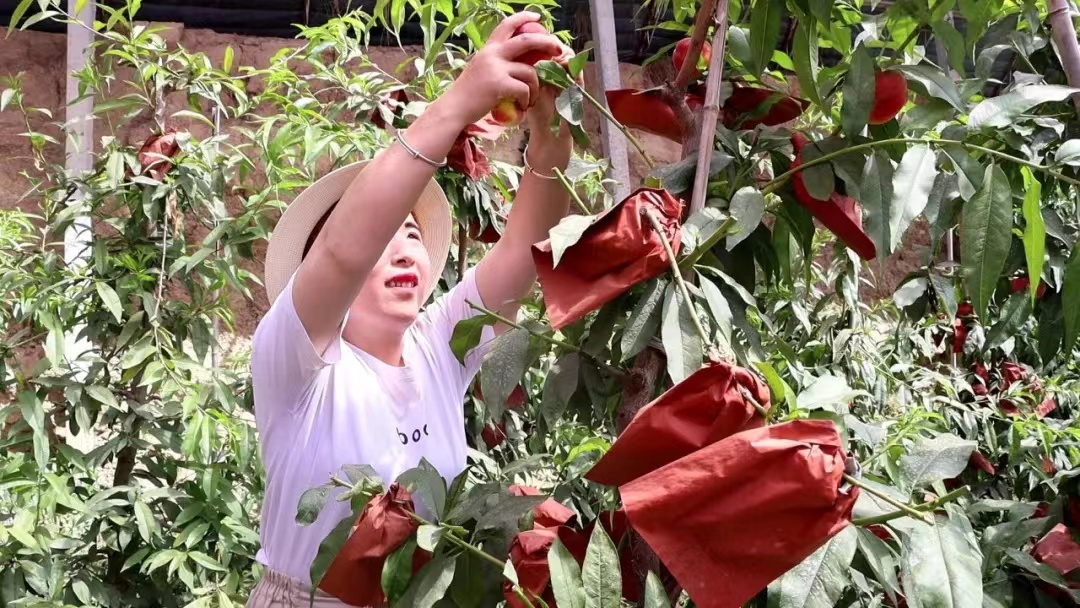 为了结出好品质的蟠桃果,在桃树花期时,他和妻子辅助桃树授粉、疏花疏叶;幼果期,每月定期给蟠桃喷洒牛奶,提升蟠桃的品相和口感;2月底,给蟠桃控旺,防止“旺长”导致枝条、叶子过繁,通风透光性变差,结果小;3月中旬,蟠桃坐果开始套袋,防止病虫害。