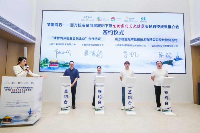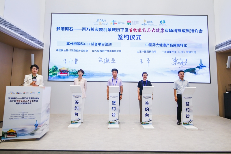 在项目签约中,才智同泽创业合伙企业与山东九紫信息技术有限公司、山东瑞航投资发展有限公司与山东螺旋矩阵数据技术有限公司签订投资协议;中京健康产业(山东)有限公司与山东中医药研究院签订成果转化协议;中国民生银行济南分行与山东探微医疗技术有限公司董事长宋维业签订高分辨眼科OCT装备项目授信1000万元协议。