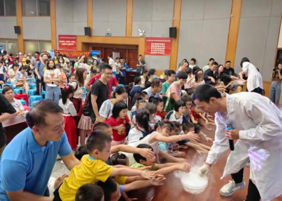 “缤纷科学表演秀”环节,两位科普讲师通过“阿拉丁神灯”“神奇大力士”“魔幻干冰秀”等精彩实验表演秀,将复杂的科学原理化作趣味横生的视觉盛宴,小朋友们积极参与互动体验。
