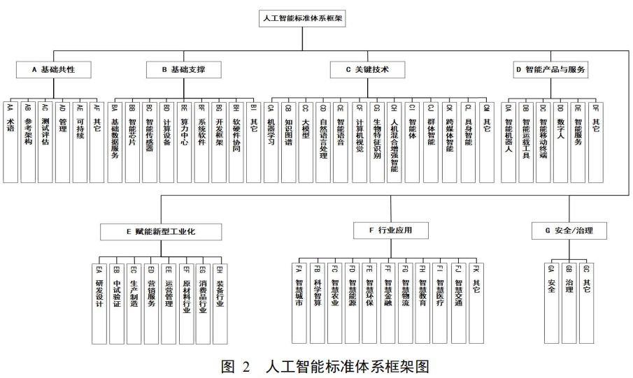 人工智能标准体系框架主要由基础共性、基础支撑、关键技术、智能产品与服务、赋能新型工业化、行业应用、安全/治理等7个部分组成,如图2所示。