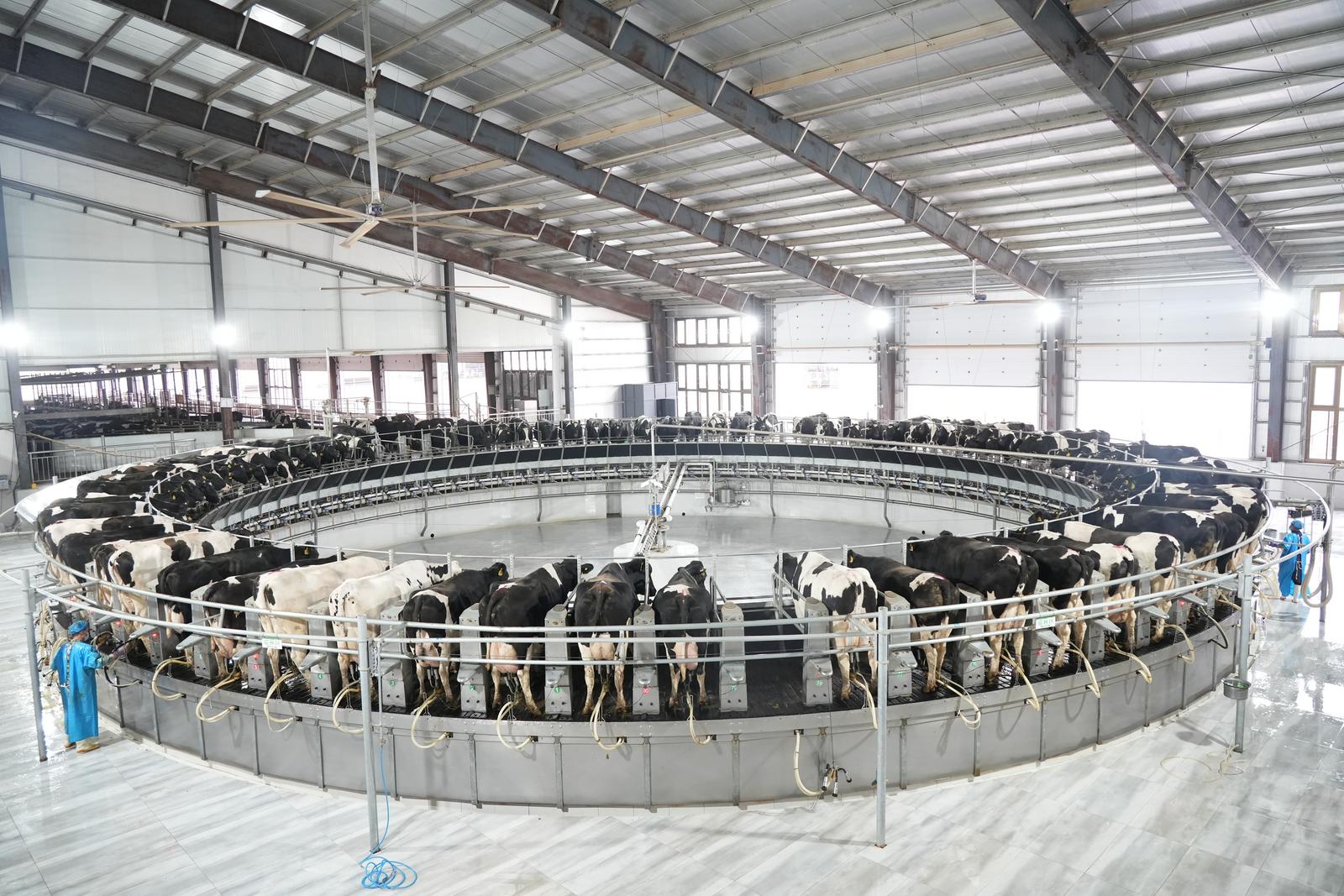 宁夏兴源达农牧有限公司智慧牧场内的转盘式挤奶机