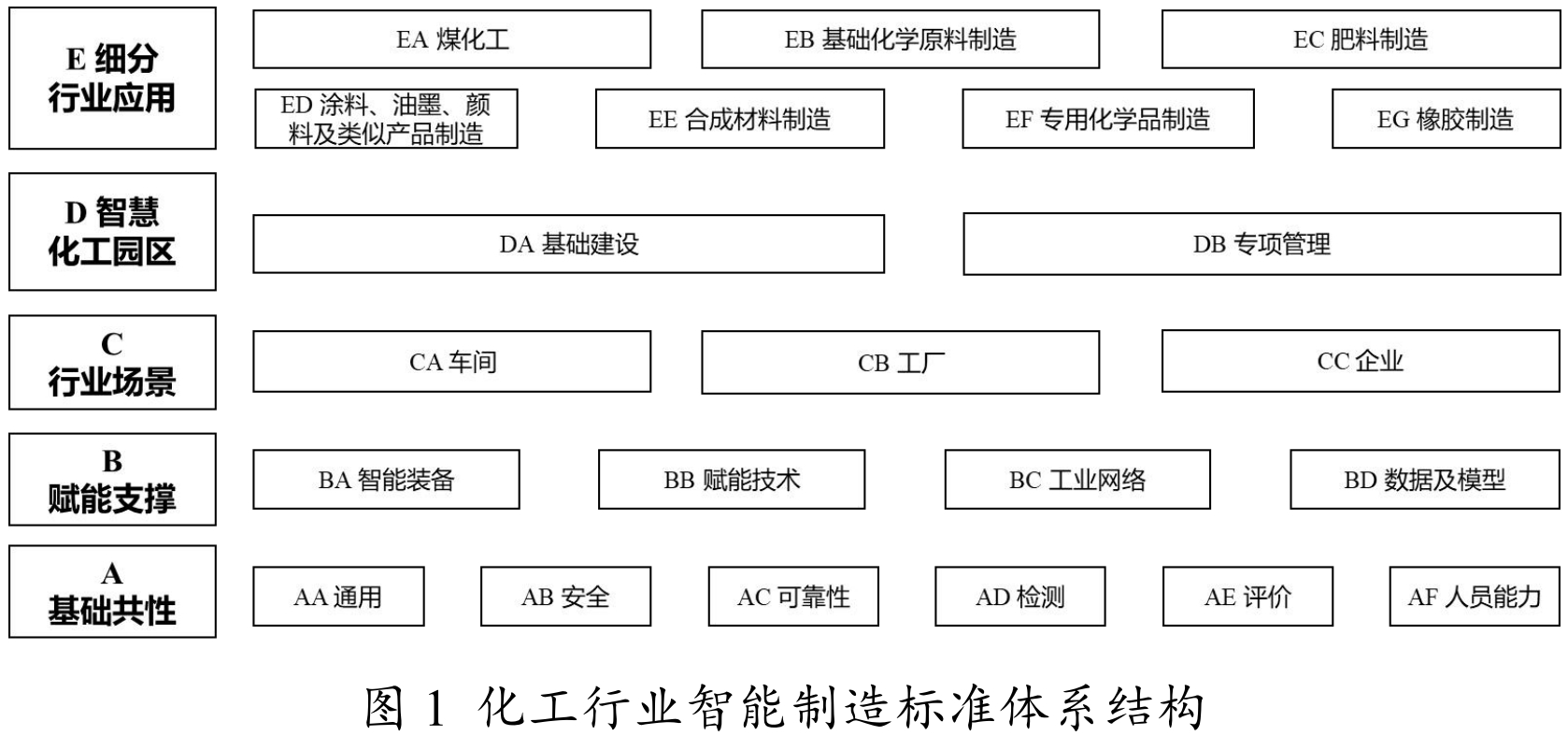 化工行业智能制造标准体系结构中,A 基础共性标准是标准体系结构的基础,为其他部分提供基础保障与共性技术;B 赋能支撑标准主要用于规范化工行业可燃、有毒、腐蚀环境下的装备、技术、网络、数据及模型,为 C 行业场景标准的建设提供赋能支撑;C 行业场景标准,从车间、工厂、企业等层级制定智能制造场景应用标准,为 E 细分行业应用标准提供支撑;D 智慧化工园区标准,从化工园区视角制定基础建设、专项管理的应用标准,赋能行业高质量发展;E 细分行业应用标准是按照化工7个子行业的具体需求,将 A 基础共性标准、B 赋能支撑标准、C 行业场景标准和 D 智慧化工园区标准进一步细化、落地。