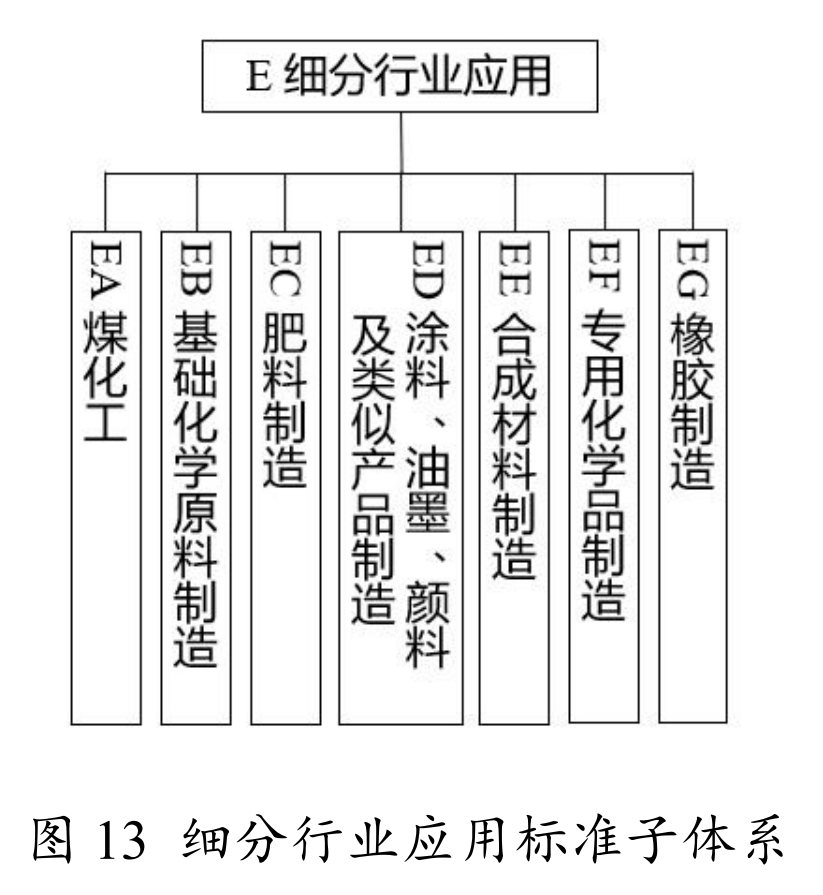 细分行业应用标准包括煤化工,基础化学原料制造,肥料制造,涂料、油墨、颜料及类似产品制造,合成材料制造,专用化学品制造,橡胶制造等7个子行业相关标准,如图13 所示。