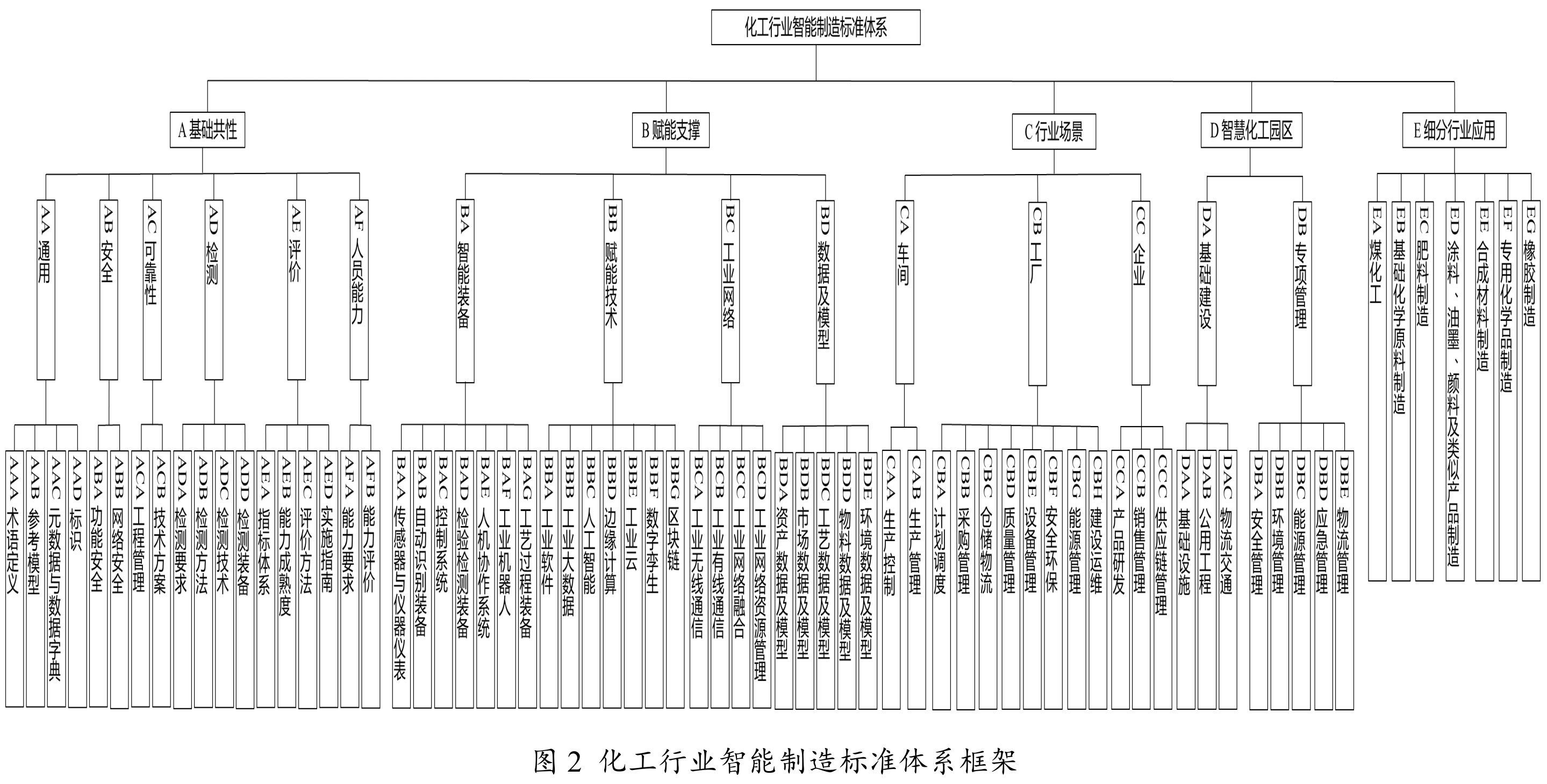 结合《国家智能制造标准体系建设指南(2021 版)》内容,化工行业智能制造标准体系框架由 A 基础共性、B 赋能支撑、C 行业场景、D 智慧化工园区、E 细分行业应用等 5个部分组成,如图2 所示。