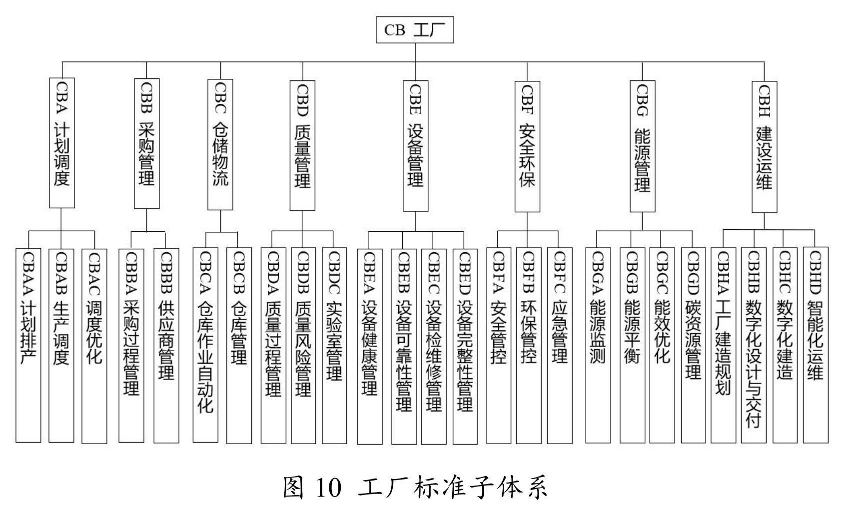 工厂标准包括计划调度、采购管理、仓储物流、质量管理、设备管理、安全环保、能源管理、建设运维等标准,如图10所示。
