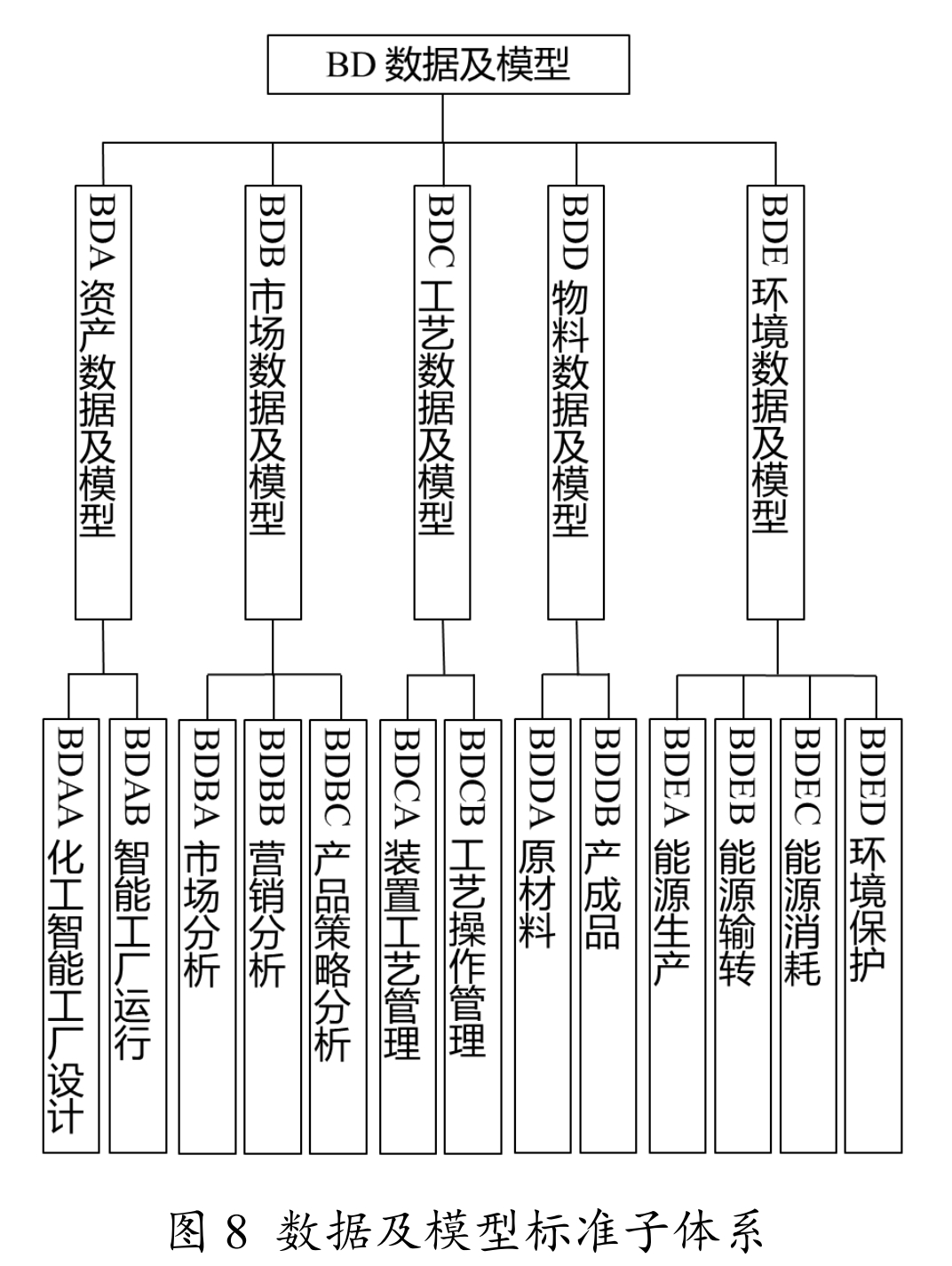 数据及模型标准包括资产数据及模型、市场据及模型、工艺数据及模型、物料数据及模型、环境数据模型等标准,如图8所示。数据及模型标准主要用于规范工企业各类数据应用模型的建立与使用等,支撑企业建设程规范化、系统集成规范化、生产过程智能化、生产制造色化。