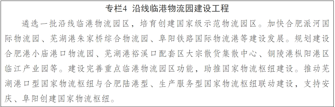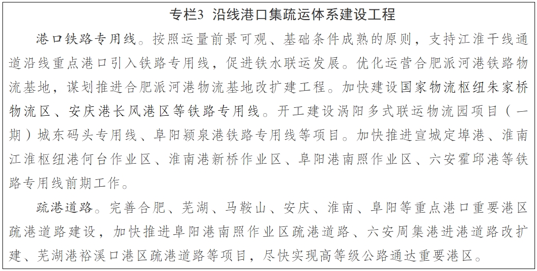 (四)推动港口集疏运体系建设。高标准推进铁水联运,加快合肥、芜湖、安庆等沿线重点港区铁路进港“最后一公里”建设;推进皖北地区铁水联运发展,支持将阜阳打造为皖北地区铁水联运中心,将六安霍邱周集港打造为铁矿石、煤炭外运至长江沿岸的铁水中转枢纽。(责任单位:省发展改革委、省交通运输厅)高标准建设沿线港口疏港道路,缓解港区与城市道路交叉影响。(责任单位:省交通运输厅)