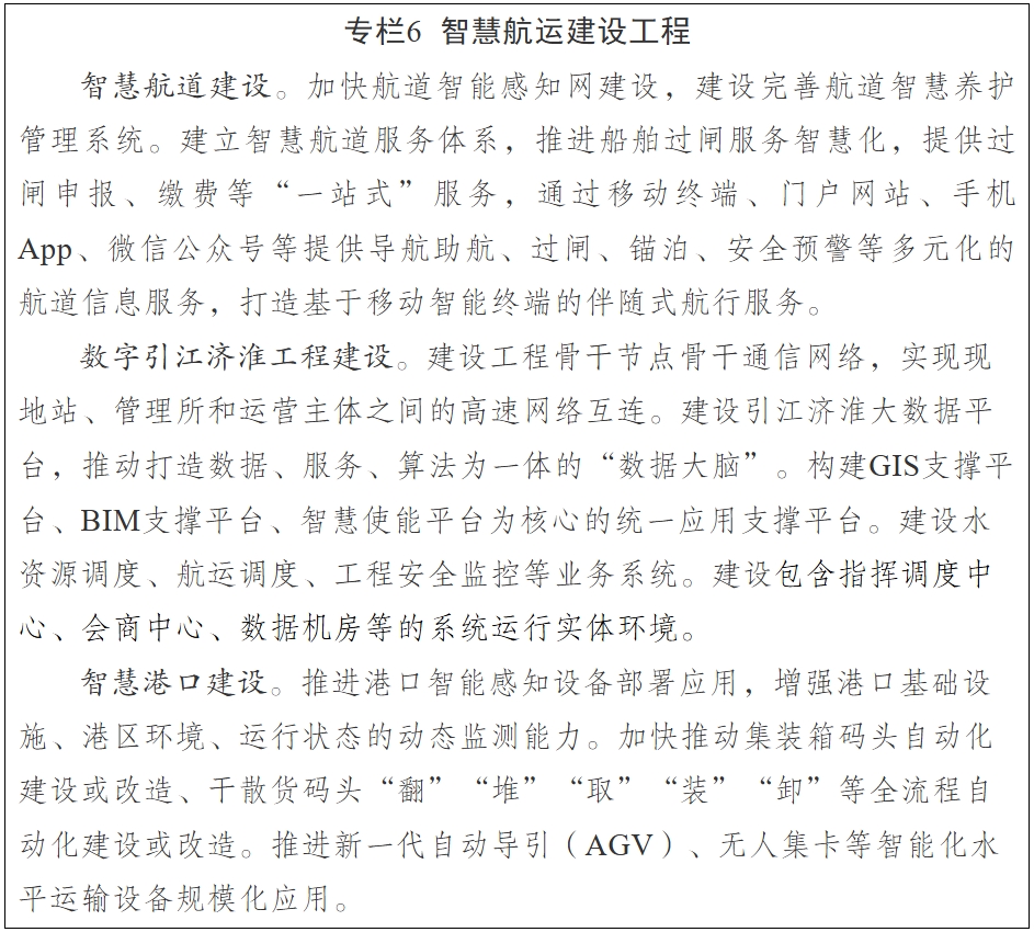 (十)建设智慧航运。建成江淮运河智慧航道,推进江淮干线水运大通道电子航道图建设,加快与长江干线电子航道图互连互通;建立多级船闸联合调度系统,优化船闸调度流程,提高主航道通航效率;完善船舶航行安全监控系统,推进水上交通执法监管系统建设,构建覆盖全要素的“水上大交管”体系。(责任单位:省交通运输厅、省引江济淮集团、省港航集团,配合单位:省水利厅)推进江淮运河水质自动站建设,推动航运船舶、水质监测、水文水情等信息在“数字引江济淮”平台实现共享。(责任单位:省生态环境厅、省引江济淮集团、省港航集团,配合单位:省交通运输厅、省水利厅、省数据资源局)建设智慧港口,推动提升集装箱码头智能化水平;鼓励港口企业建设数字化生产调度系统,提高码头生产效率。(责任单位:省交通运输厅、省港航集团、省引江济淮集团,配合单位:省数据资源局)