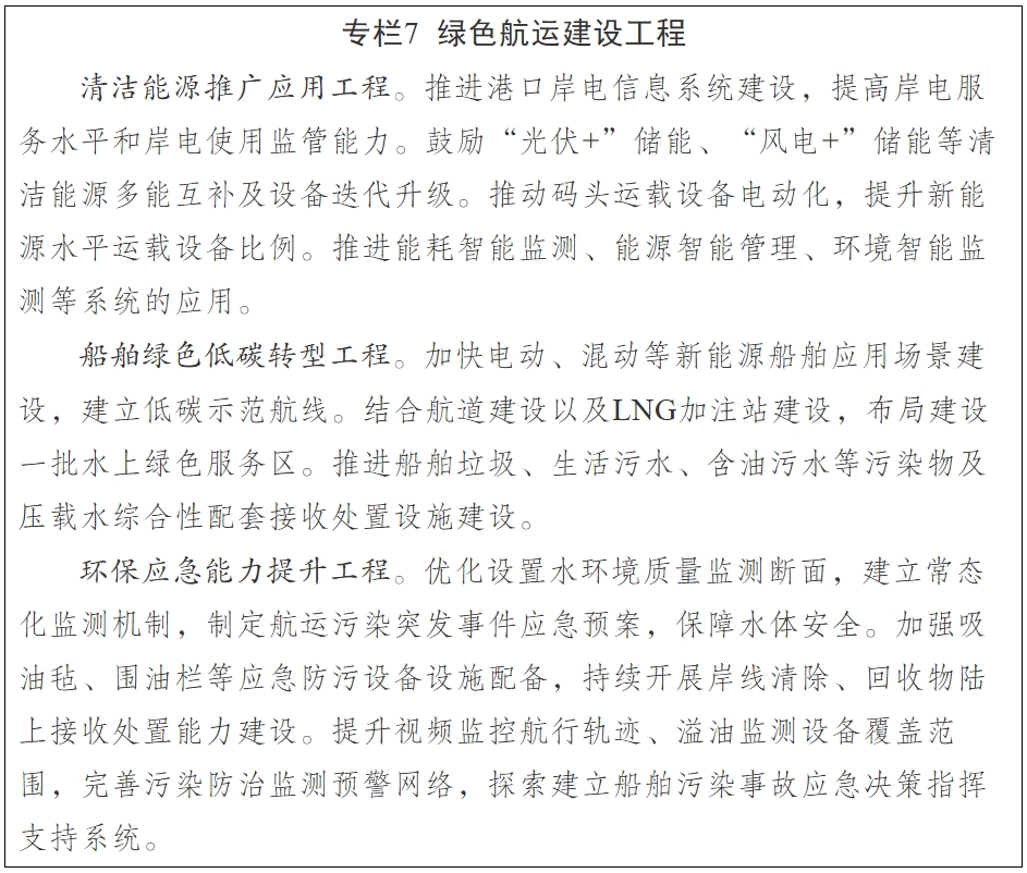 (十三)推广绿色清洁船型。鼓励液化天然气(LNG)和纯电、氢、甲醇等新能源动力在船舶上推广运用,统筹科技创新、制造强省建设、新兴产业发展等支持政策,制定清洁能源动力船舶补助政策。探索新能源船舶人员配备等规范,配套建设服务区、港口充换电设施。实施清洁能源船舶优先优惠过闸政策,降低清洁能源船舶营运成本。(责任单位:省交通运输厅、省发展改革委、省工业和信息化厅、省财政厅)
