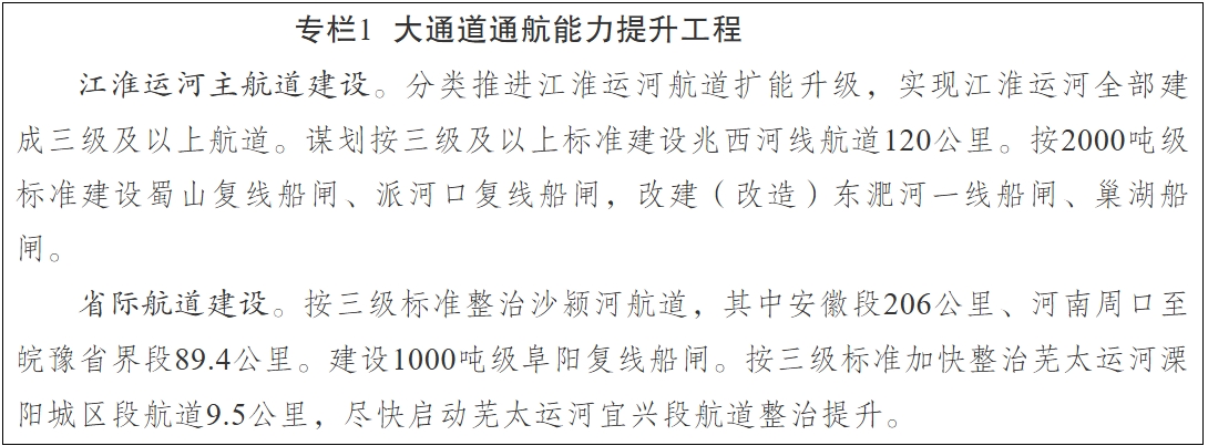 (二)推进沙颍河和芜太运河三级航道提升建设。与河南省协同推进沙颍河航道整治提升行动,推动安徽段阜阳复线船闸建设。会同江苏省提升芜太运河航道通航能力,持续开展安徽段航道专项养护。(责任单位:省交通运输厅、省发展改革委、省港航集团)